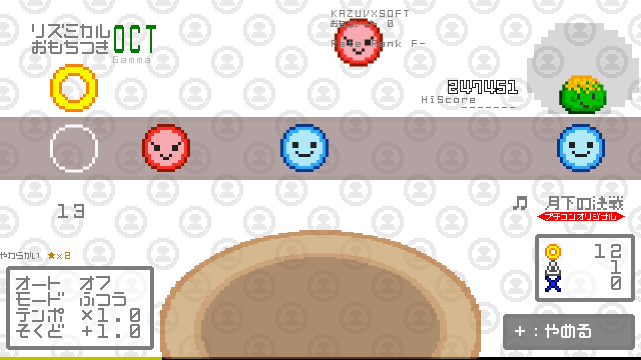 概要 OCTの特徴多彩なモードがあったり、レートシステムがあったりと盛りだくさんあるおもちつきだ。 更に...リズミカルおもちつきCIが登場!GI派生のリズミカルおもちつきCIがあります。 でも止めたいときには+連打だ… 本当に止めたいならタイトルでおわるを連打だ。 難易度の段階OCTでは難易度ふつうがないのでご注意を。